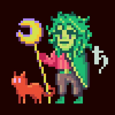 Witch Keziah Foster is a 130-year-old former black magic school master who enjoys spells, potions, theater, and old tales. He is mysterious and kind, but can also be very lonely and a bit shy. Physically, Keziah is in pretty good spirits since he was a young child. He is short with pale green skin and green eyes. He has asymmetrical ears, though they they never see the light of day due to his chaotic green hair